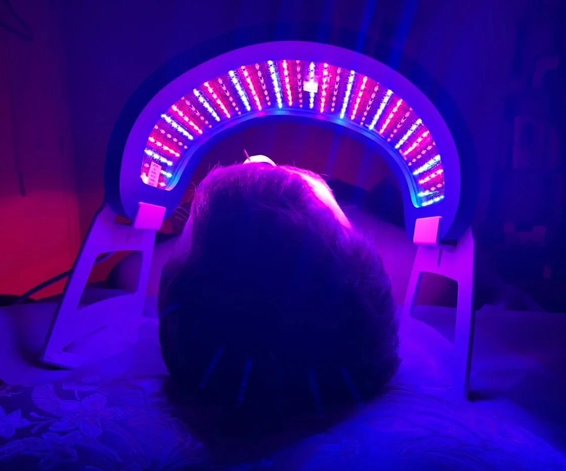 Red Light Therapy stimulates skin cell energy with red and blue lights to improve collagen and elastin production, reduce wrinkles and scarring, and heal hyperpigmentation over time.